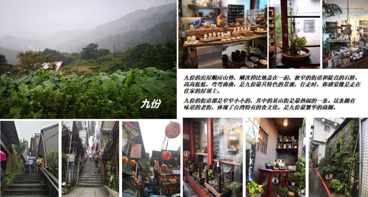 九份老街 据说这里最早有九户人家,由于比较偏僻,大家到山下买东西都买九份,因而得名。九份建筑群顺着地势沿山建造,基本保留着日治时代的旧式建筑,狭窄的街道和陡直的石阶,高高低低,弯弯曲曲,行走时,感觉像是走在屋顶上。